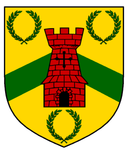 The arms of the Canton of Bryniau Tywynnog: Or, a chevron vert surmounted by a tower gules between three laurel wreaths vert.