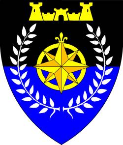 The arms of the Shire of Bastile du Lac: Per fess sable and azure a compass rose Or within a laurel wreath argent and in chief a castle of two towers Or.