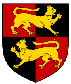 - Device: Quarterly gules and sable, two cats passant, the first contourny Or.