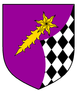 - Device: Purpure, a comet bendwise sinister Or and a sinister gore lozengy sable and argent.