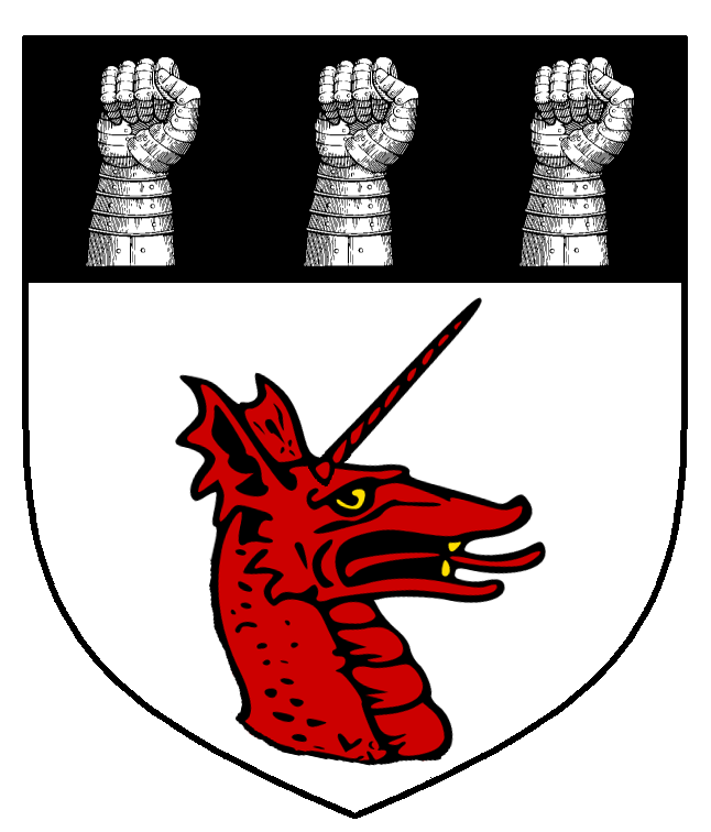 - Device: Argent, a unicornate dragon's head contourny couped gules, on a chief sable three dexter gauntlets clenched argent.