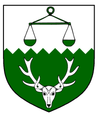 - Device: Per fess indented argent and vert, a hanging balance and a stag's head cabossed counterchanged.
