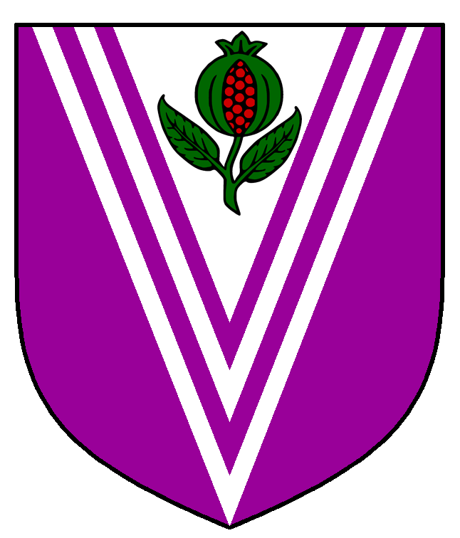 Arms: Purpure, on a pile double cotised argent, a pomegranate slipped and leaved vert, seeded gules. (Drawn by THL Dietrich Von Sachsen