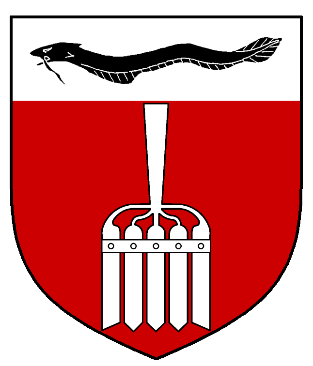 • Device: Gules, an eel-fork and on a chief argent an eel sable.