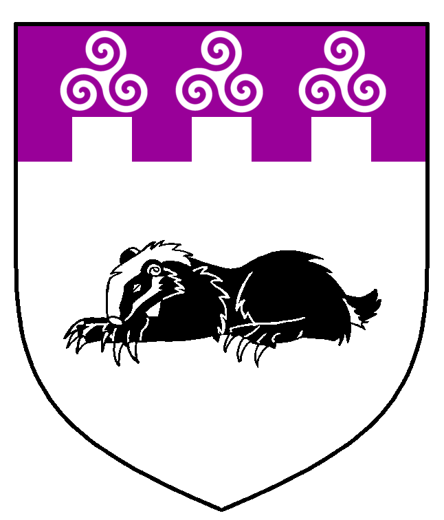 • Device: Argent, a badger dormant sable marked argent, on a chief embattled purpure three triskelions of spirals argent.