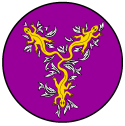 - Device: Purpure, three salamanders in pall, conjoined at the tails Or, enflammed argent.
