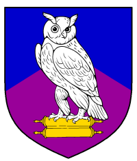 - Device: currently, Per chevron azure and purpure, an owl between in chief two feathers argent; being changed to Per chevron azure and purpure, an owl argent maintaining a closed scroll fesswise Or.
