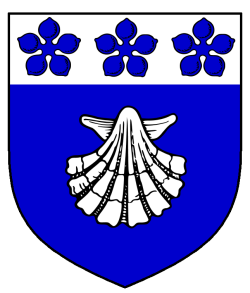 • Device: Azure, an escallop and on a chief argent three cinquefoils azure.