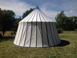 How to find Marie at camping events… look for the 17' blue-striped spoke-n-wheel round pavillion with music coming out of it! Pavillion construction, and photo, by Fritz Wilhelm.