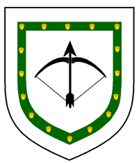 - Device: Argent, a bow fesswise drawn and with an arrow nocked sable within an orle vert semy of acorns Or.