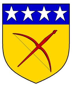 - Device: Or, a bow and an artist's brush in saltire gules and on a chief azure four mullets argent.