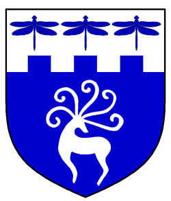 - Device: Azure, a hart trippant reguardant contourny, on a chief embattled argent three dragonflies azure.