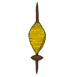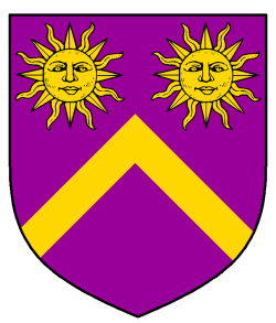 - Badge: (Fieldless) a wooden drop spindle proper, threaded Or.