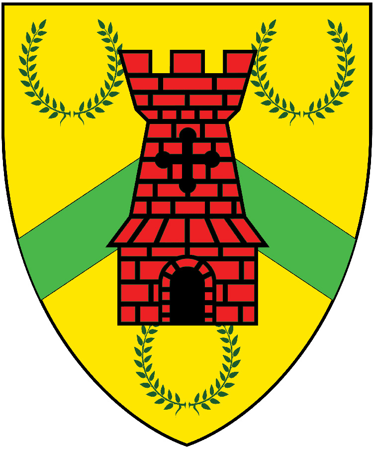 - The arms of the Canton of Bryniau Tywynnog: 'Or, a chevron vert surmounted by a tower gules between three laurel wreaths vert.'