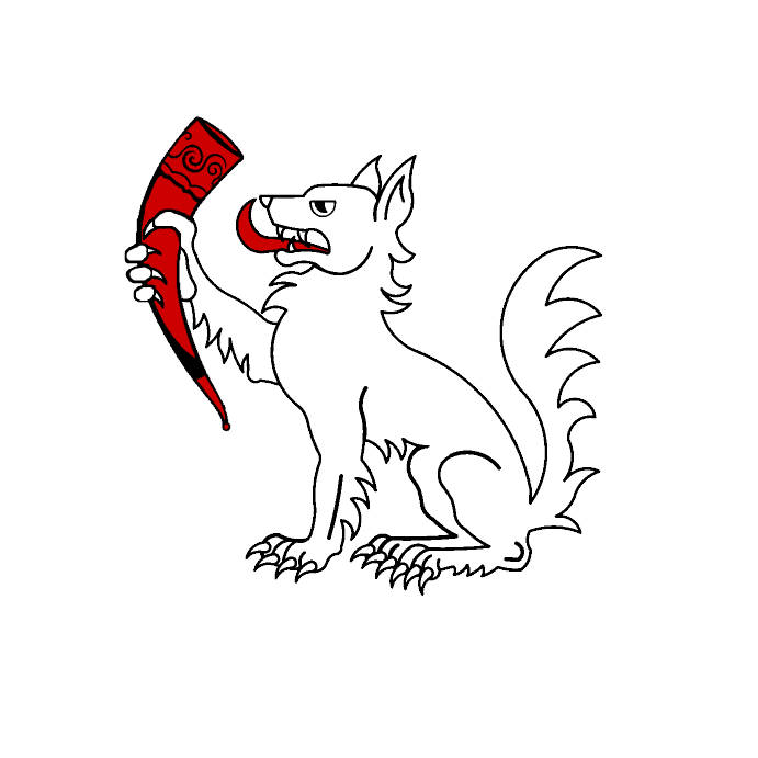 Recipients gain the right to bear the badge (Fieldless) A wolf sejant argent maintaining a drinking horn gules. This badge was first created during the Reign of Baldric I and Breyla I.