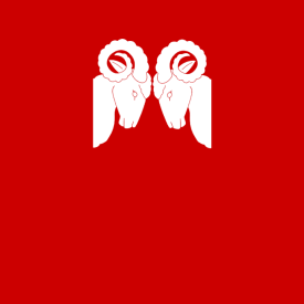 The registered heraldry for the Guidon de Sang is: Gules, in chief two ram's heads couped respectant argent. In layman's terms, this is a red field with the populace badge of Ramshaven, two white butting rams' heads, in the top third. As the award is called a “Guidon” it traditionally given as a guidon, which is a small military flag. The two thirds of the flag which are left as as red field in the registered version are to be filled with the recipient's personal arms.