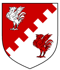 - Device: Per bend sinister embattled gules and argent, two cocks rising, wings elevated and addorsed, counterchanged.