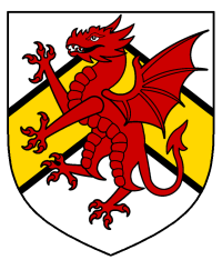 - Device: Argent, a chevron throughout Or fimbriated sable, overall a dragon gules.