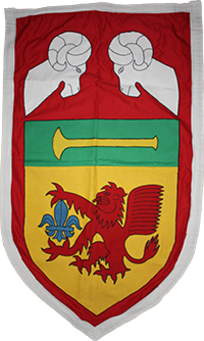 - Device: Or, a winged lion rampant gules maintaining a fleur-de-lis azure, on a chief vert a straight trumpet Or.
