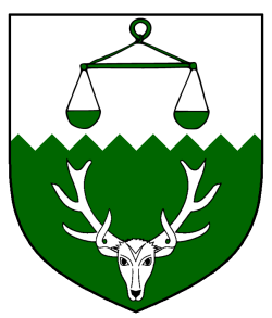 - Device: Per fess indented argent and vert, a hanging balance and a stag's head cabossed counterchanged.