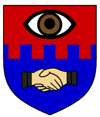 - Device: Per fess embattled gules and azure, a human eye irised brown and a foi proper.