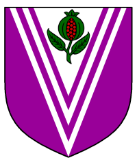 - Device: Purpure, on a pile double cotised argent, a pomegranate slipped and leaved vert, seeded gules.