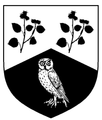 - Device: Per chevron argent and sable, two hazel sprigs and an owl counterchanged.