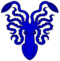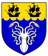 - Device: Azure, a calamarie argent and on a chief invected Or two caravels sable.