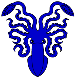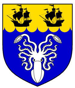 - Device: Azure, a calamarie argent and on a chief invected Or two caravels sable.
