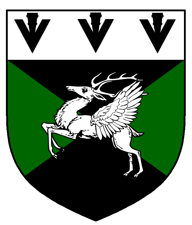 - Device: Per saltire sable and vert, a winged stag salient, on a chief argent three broadarrows sable