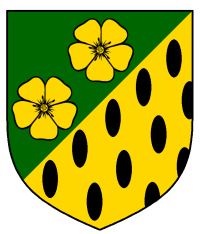 - Device: Per bend sinister vert and Or semy of cartouches sable, in bend sinister two roses Or.