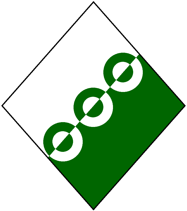 • Device: Per bend sinister argent and vert, three annulets in bend sinister counterchanged.