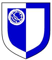 - Device: Per pale azure and argent, in canton an astrolabe argent, a bordure counterchanged.