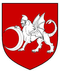 - Device: Gules, a bat-winged manticore wearing a Phrygian cap passant sustaining an increscent argent.