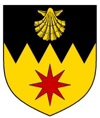 - Device: Per fess indented sable and Or, an escallop Or and a mullet of eight points gules.