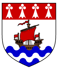 - Device: Argent, a lymphad proper sails set and flagged gules issuant from a ford proper, a chief gules ermined argent.