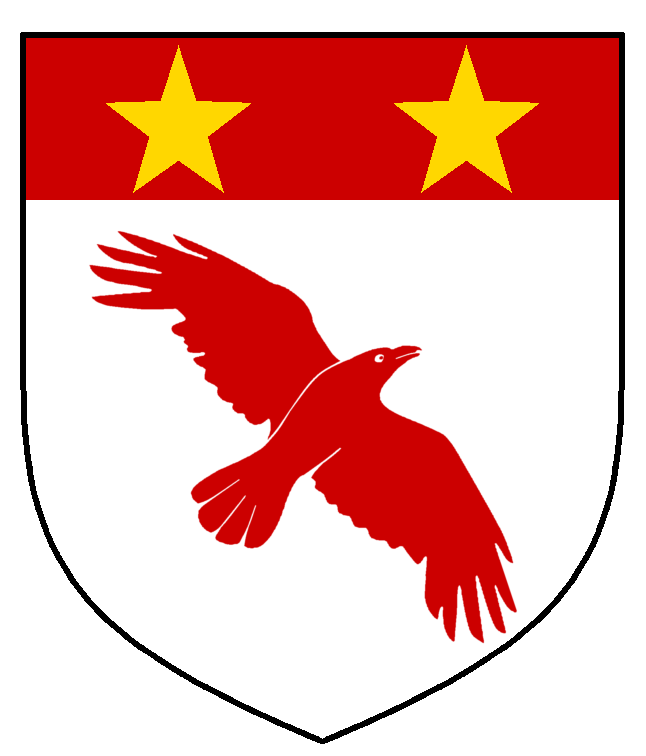 - Device: Argent, a crow volant to sinister chief, on a chief gules two mullets Or.