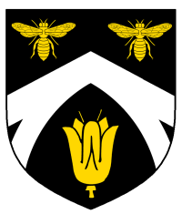 - Device: Sable, a chevron enarched within and conjoined at the point to a chevron argent between two bees and a lily Or.