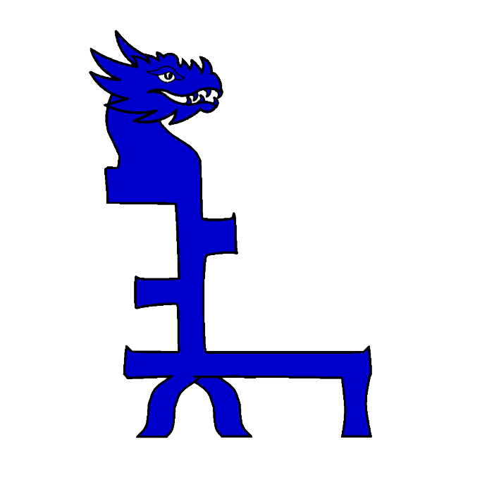• Badge: (Fieldless) A dragon-headed andiron contourny azure.