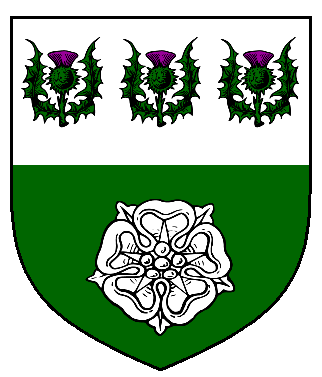• Device: Per fess argent and vert, three thistles proper and a rose argent.