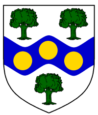- Device: Argent, on a fess wavy azure between three trees vert three bezants.
