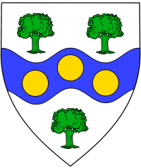 Argent, on a fess wavy azure between three trees vert three bezants, image pending.