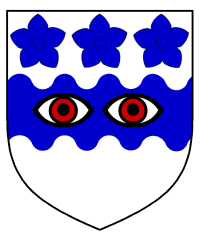- Device: Argent, on a fess wavy azure, two eyes argent irised gules and in chief three forget-me-nots azure.