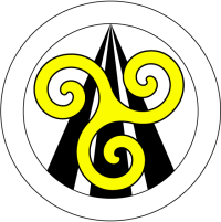 - Badge: (Fieldless) Three piles inverted couped conjoined in point sable within and conjoined to an annulet argent, the piles surmounted by a triskelion of spirals Or.