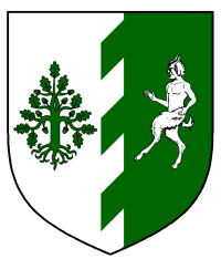 - Device: Per pale raguly argent and vert, an oak tree eradicated and a satyr passant counterchanged.