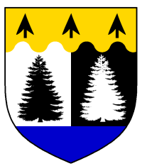 - Device: Per pale argent and sable, two cedar trees counterchanged on a chief wavy Or three arrowheads inverted sable, and a base azure.