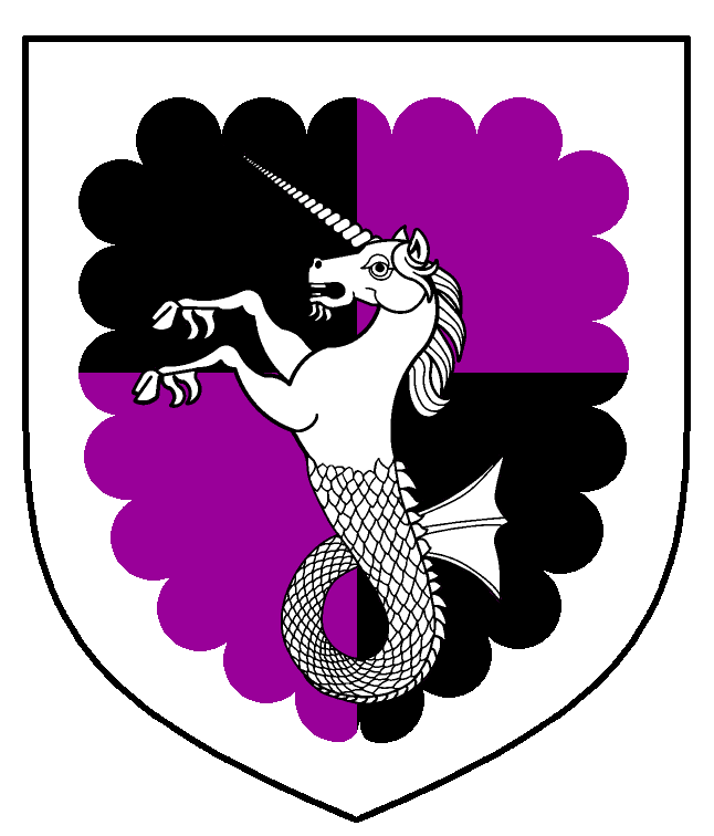 - Device: Quarterly sable and purpure, a sea-unicorn and a bordure engrailled argent.
