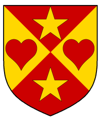 - Device: Per saltire Or and gules, two hearts gules and two mullets Or.