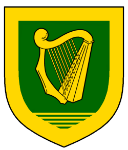 - Device: Vert, a harp and in base five barrulets within a bordure Or.