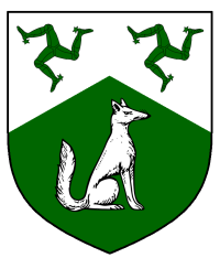 - Device: Per chevron argent and vert, two triskelions of legs in armor and a fox sejant to sinister counterchanged.